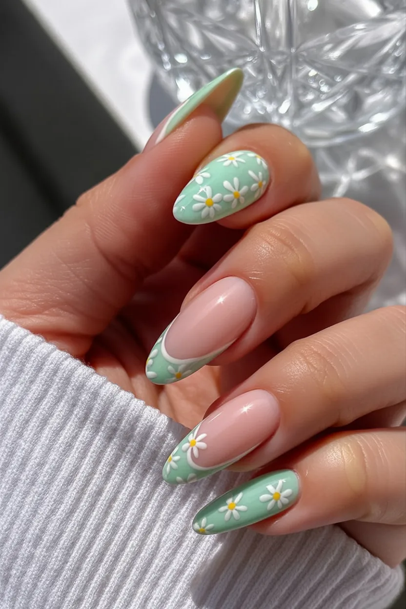 This look is proof that subtle can still be stunning. The soft nude base lets the delicate green stems and tiny daisies shine without overwhelming the nail. It feels calm, natural, and quietly sophisticated—like a perfectly tailored beige blazer.