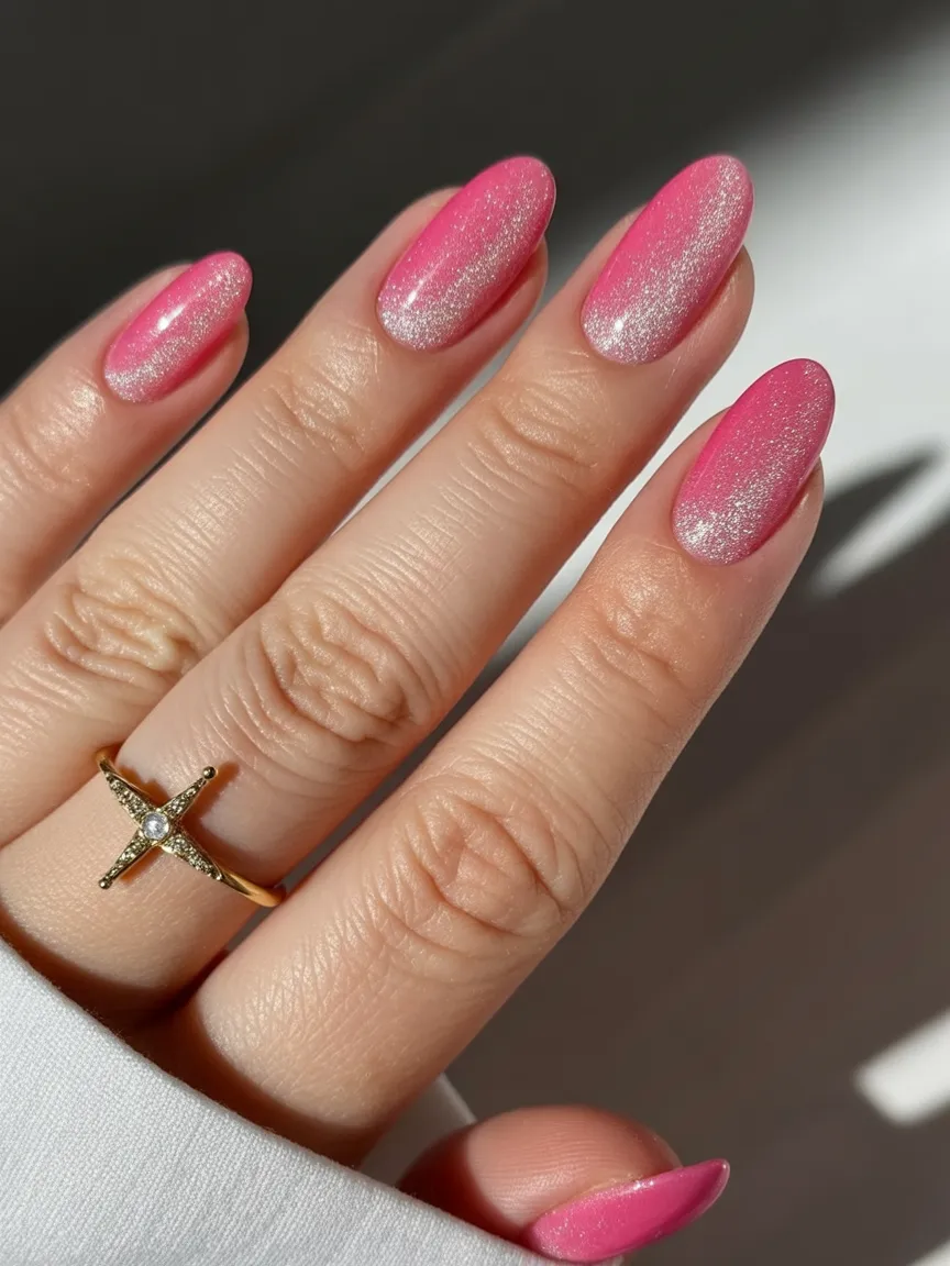 8. Pink Sparkle Chrome Almond Nails