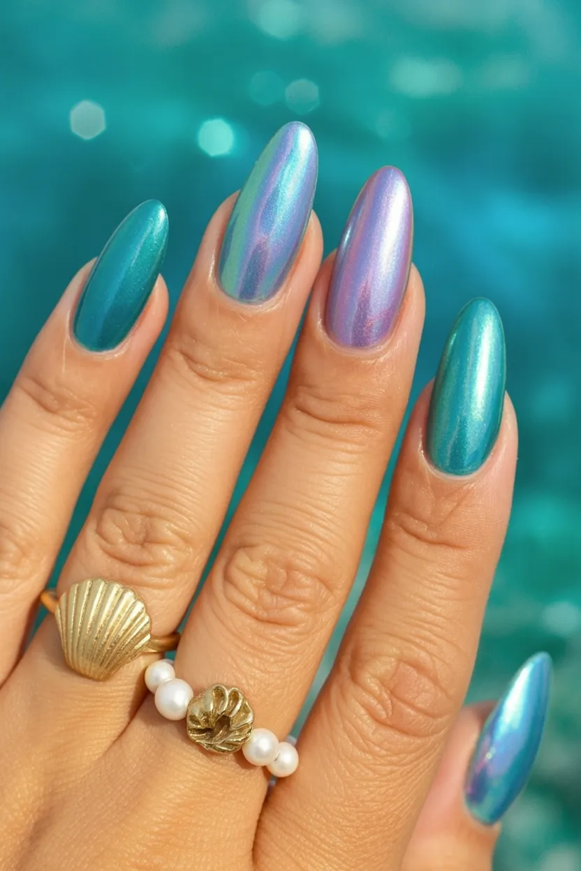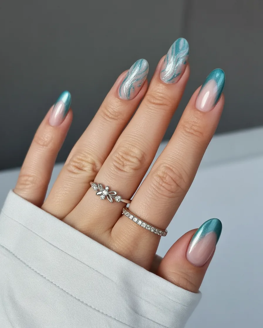 17. Teal Chrome Almond Nails with Subtle Art