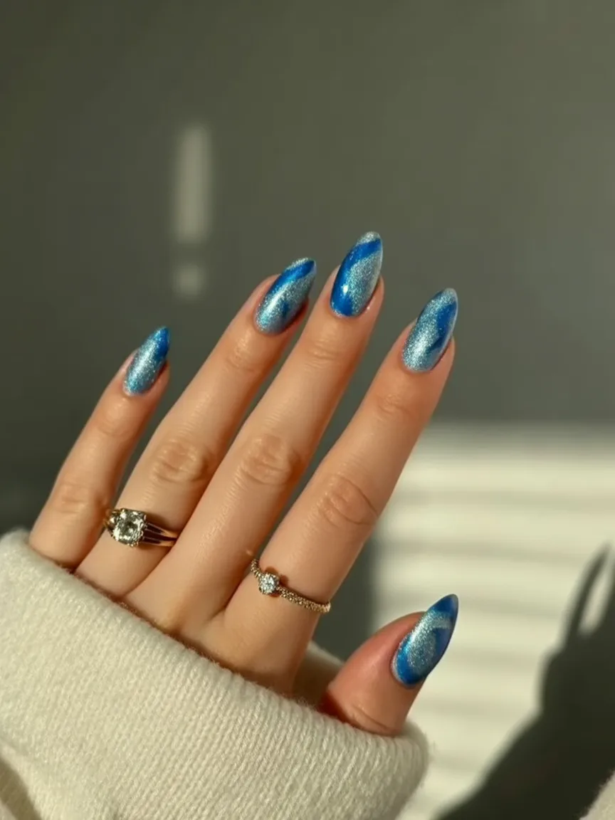 6. Blue Chrome Almond Nails with Metallic Glow