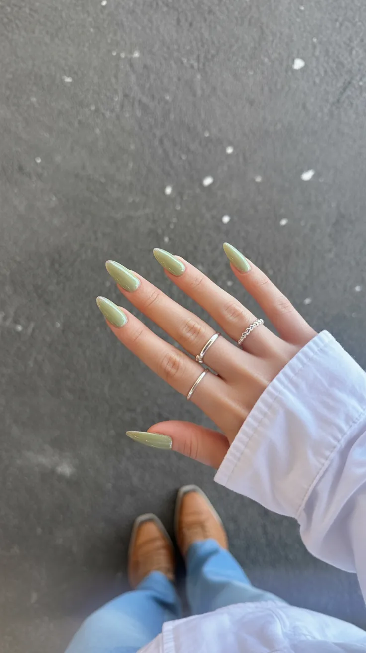 9. Soft Green Chrome Almond Nails