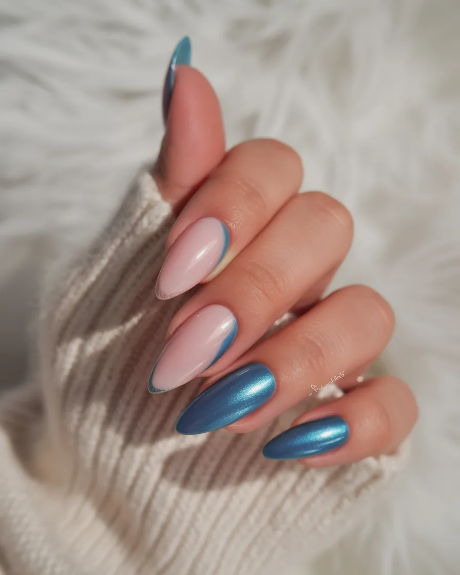 7. Blue Chrome French Almond Nails