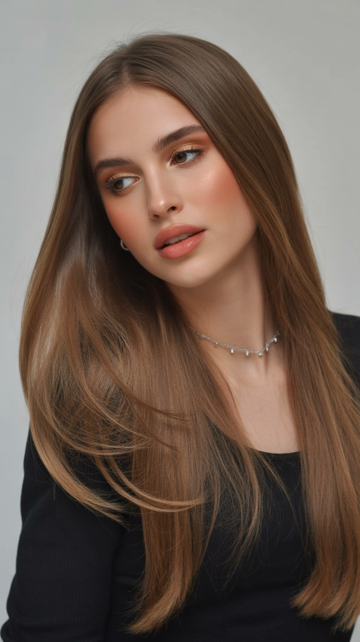 There’s something quietly confident about this look. The gentle layers and face-framing pieces create a calm, polished impression without trying too hard. It feels approachable yet intentional, the kind of style that makes people think you’ve got great taste—even on your most low-key days. The mix of dark roots with light accents keeps it modern and flattering, especially for women who want elegance without stiffness.