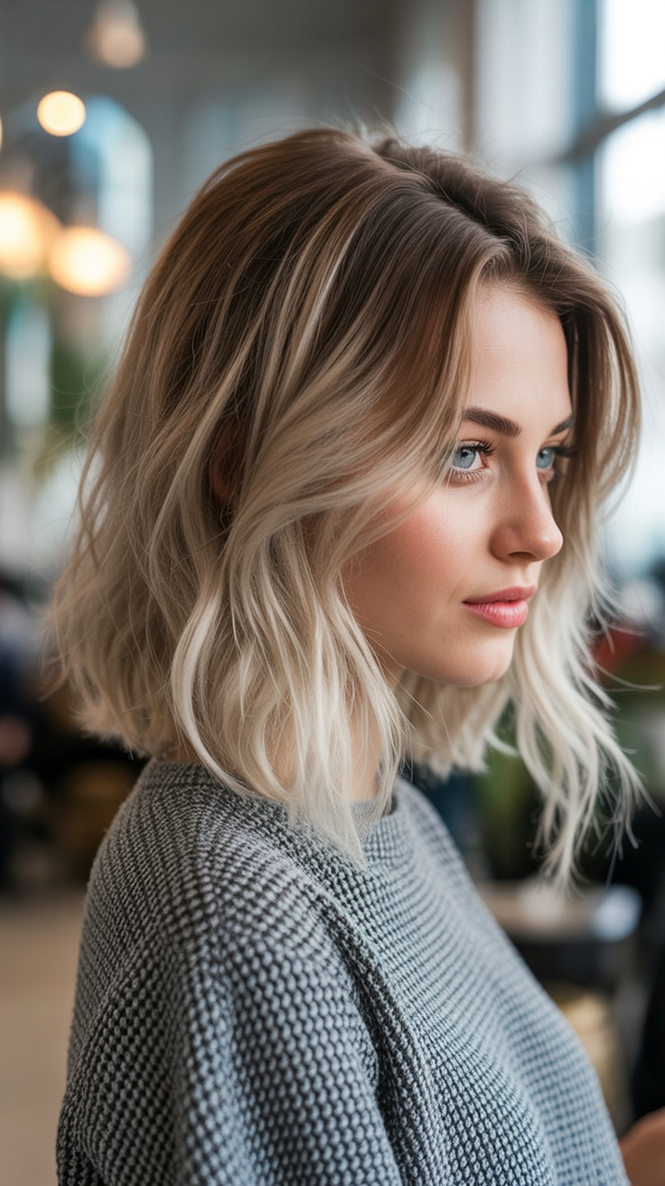 This lob has that easy, lived-in charm that never goes out of style. The soft blonde tone and relaxed waves create a casual elegance that feels approachable and modern. It’s the kind of hairstyle that looks great with minimal makeup and simple outfits, letting your natural beauty shine through.