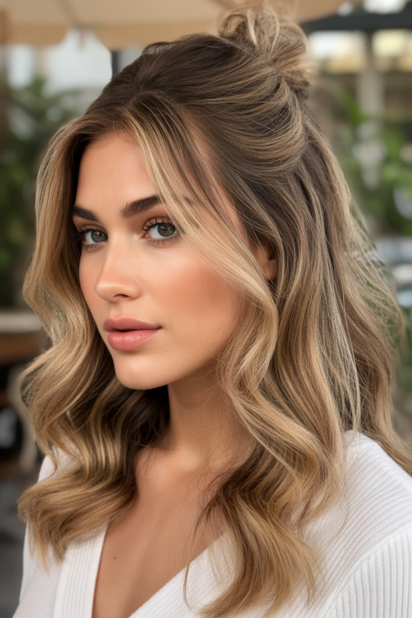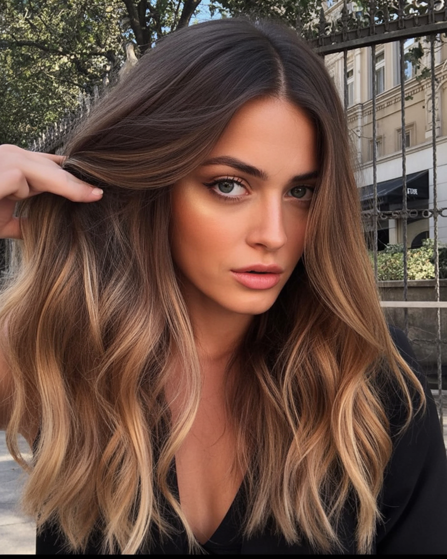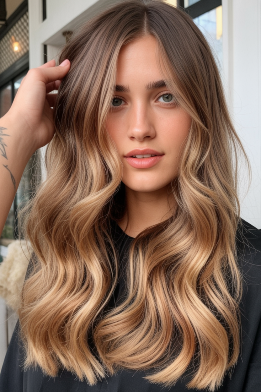 This look feels warm, inviting, and quietly luxurious. The flowing waves and golden light ends add dimension that catches the eye without overwhelming the natural brown base. It’s the kind of hair that feels timeless—soft enough for everyday wear, yet polished enough for special moments.