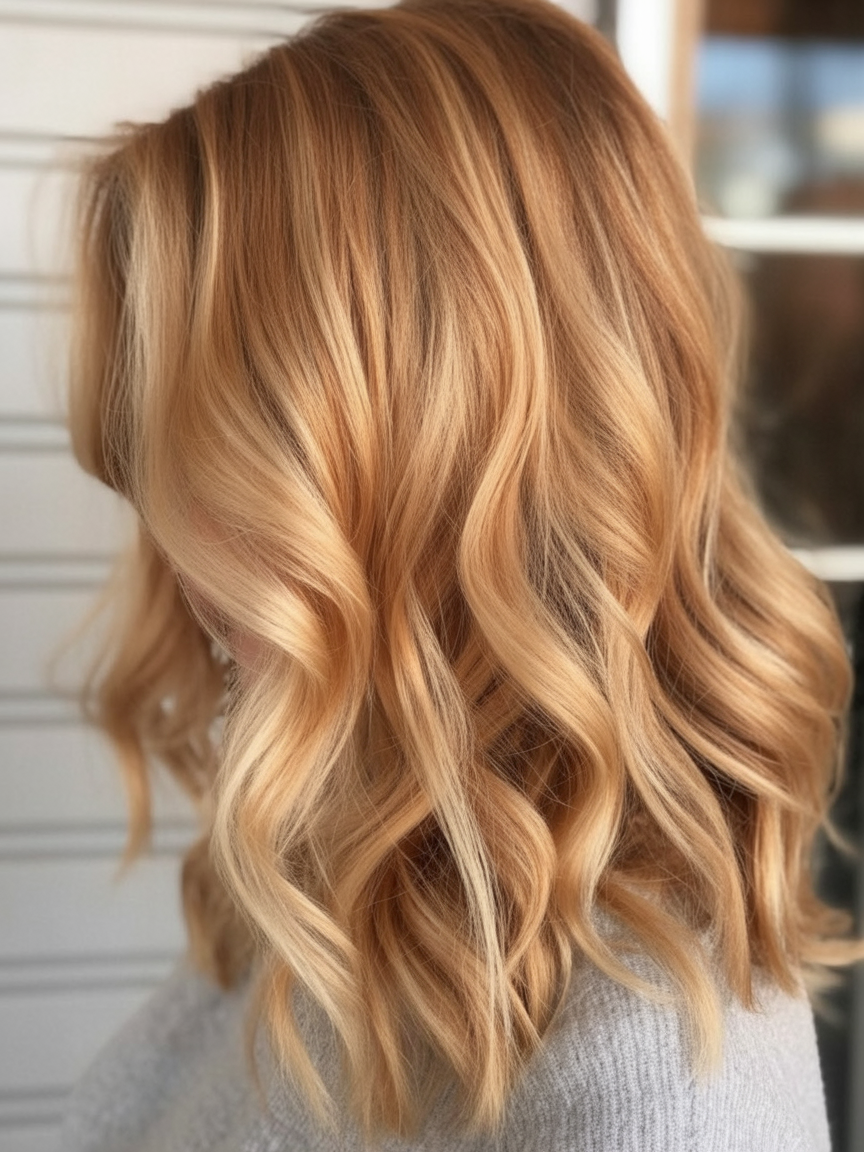 This warm, honey-toned look feels inviting and full of life. The waves create movement that catches the light beautifully, giving the hair a healthy, touchable finish. It has that cozy-but-fresh vibe that works perfectly for spring—soft, flattering, and naturally radiant.