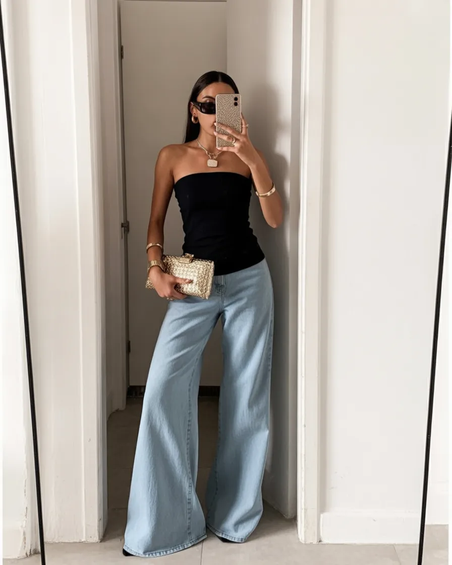 7. Strapless Black Top with Wide-Leg Denim