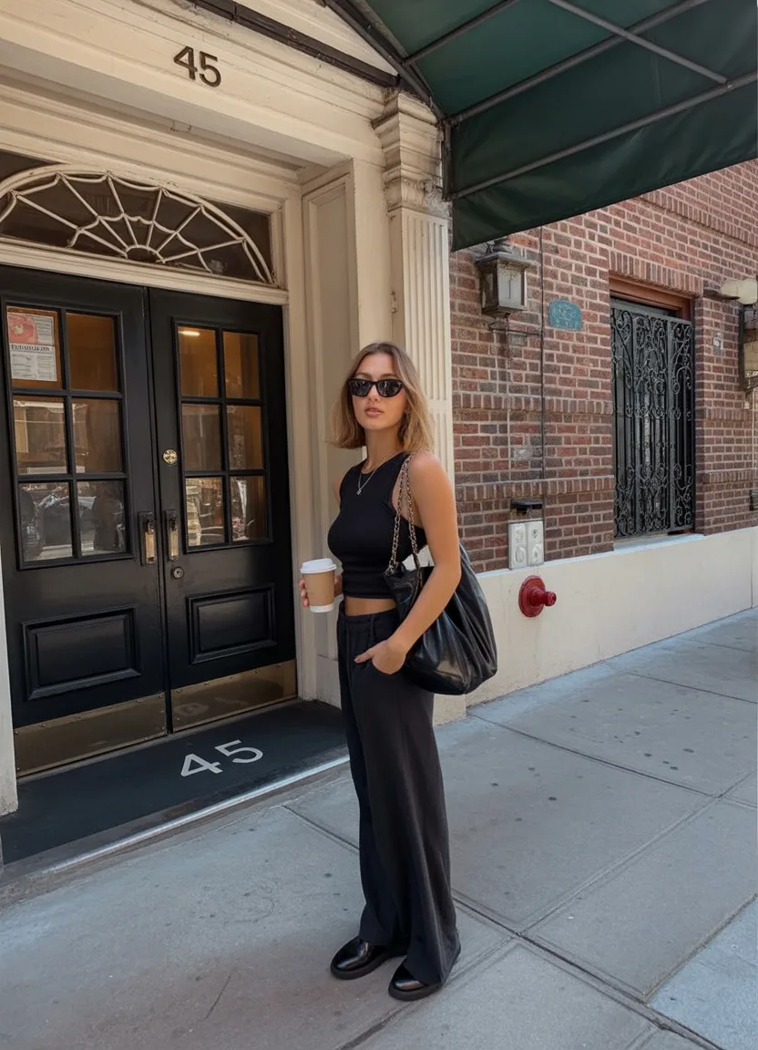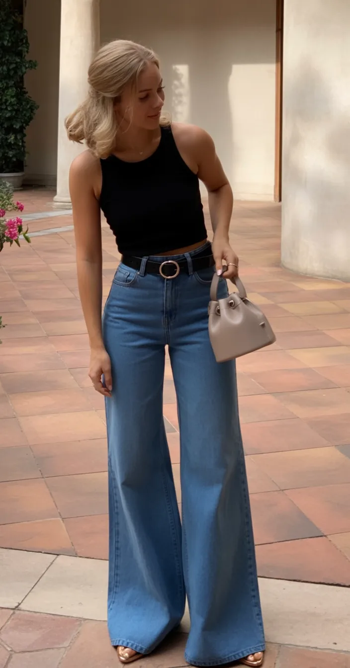 There’s something timeless and feminine about this look. The black tank feels clean and confident, while the wide-leg jeans bring movement and ease. It’s relaxed but intentional — the kind of outfit that feels just as good as it looks.