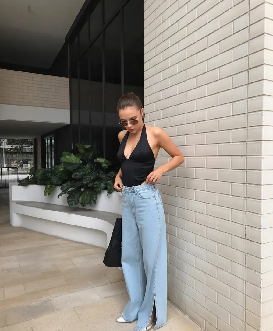 This look The confident and slightly edgy vibe is very modern. The halter top brings a little drama while the light denim is very down to earth. It is an ideal combo of both bold and casual.
