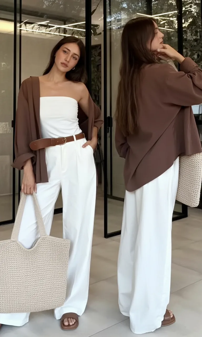 One of the best things about this option is its versatility. The wide-leg pants are comfy and flattering, especially for plus-size and curvy figures, and allow for easy movement throughout the day. This is a great choice for casual work environments, running errands, or going to lunch when you want to look nice without being overly dressy. It’s on-trend, functional, and very suitable for your 40s.