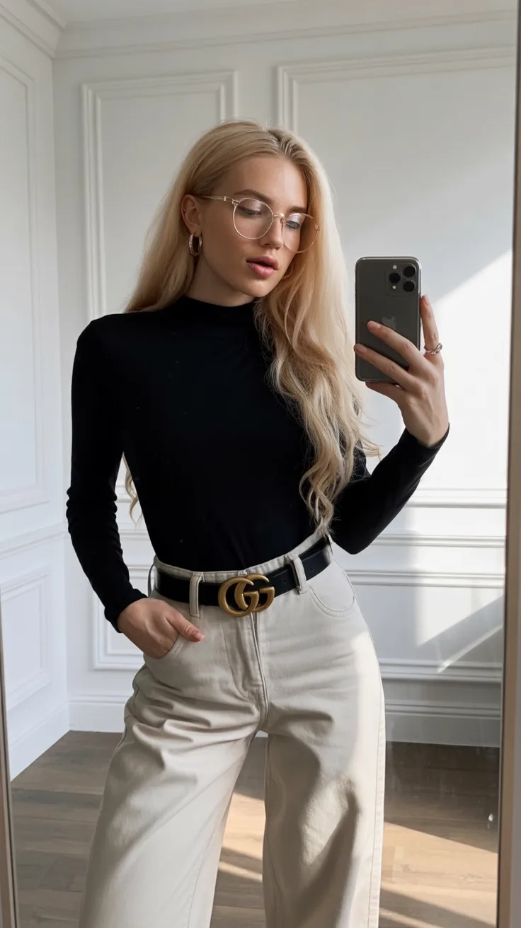 This outfit is proof that classic doesn’t have to mean boring. The fitted black top paired with neutral-toned jeans feels timeless, confident, and very wearable. It’s the kind of look that makes you feel instantly put together, even on low-energy days.