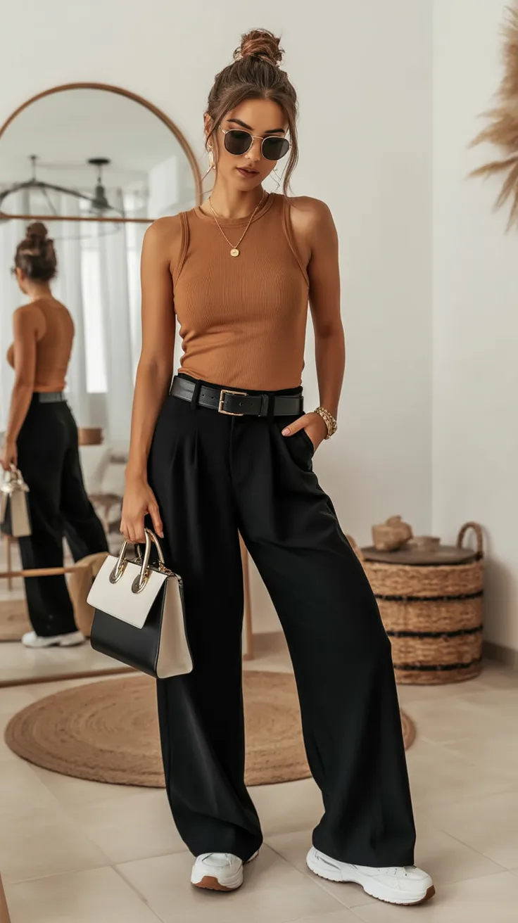 20. Warm Neutral Top with Black Wide-Leg Pants