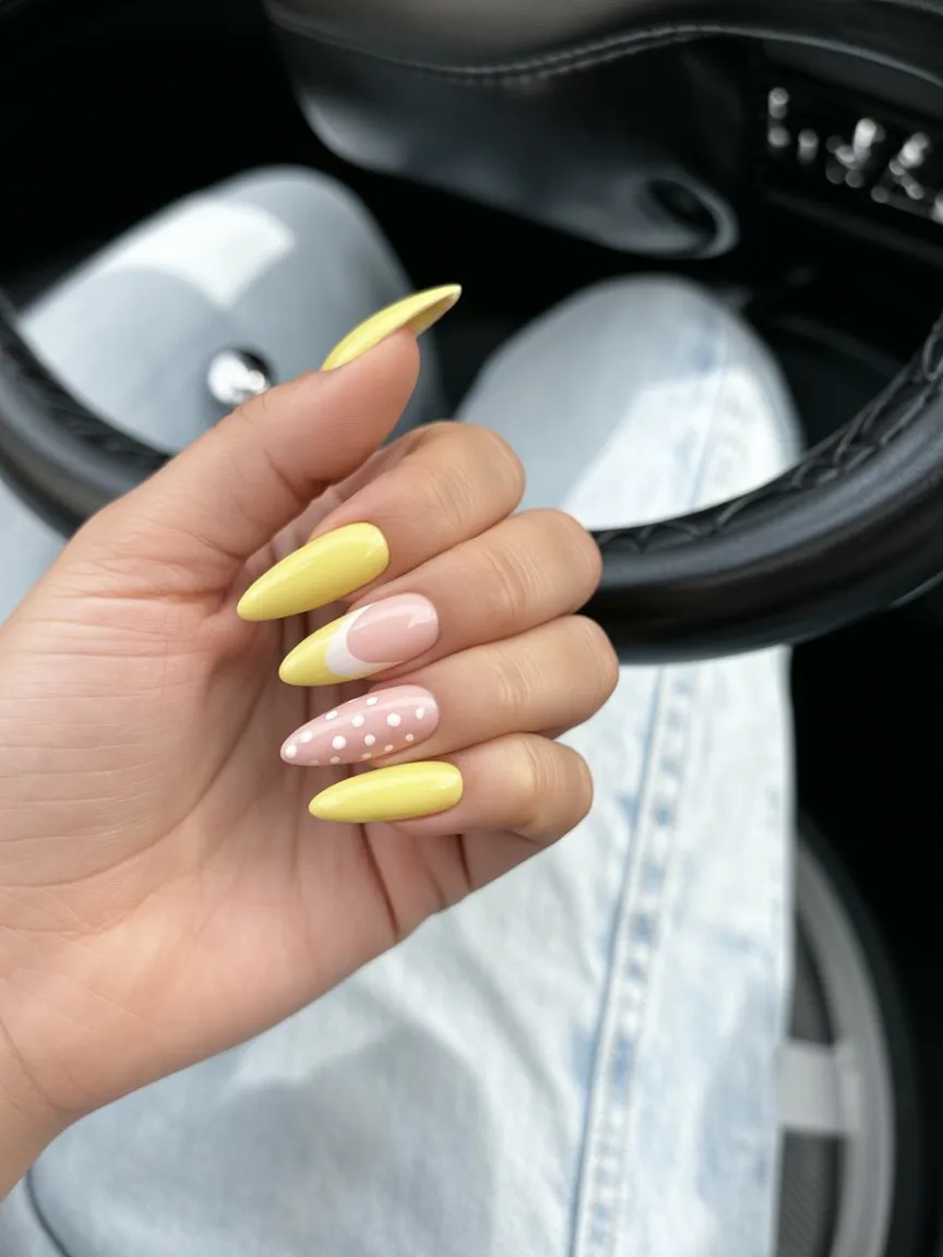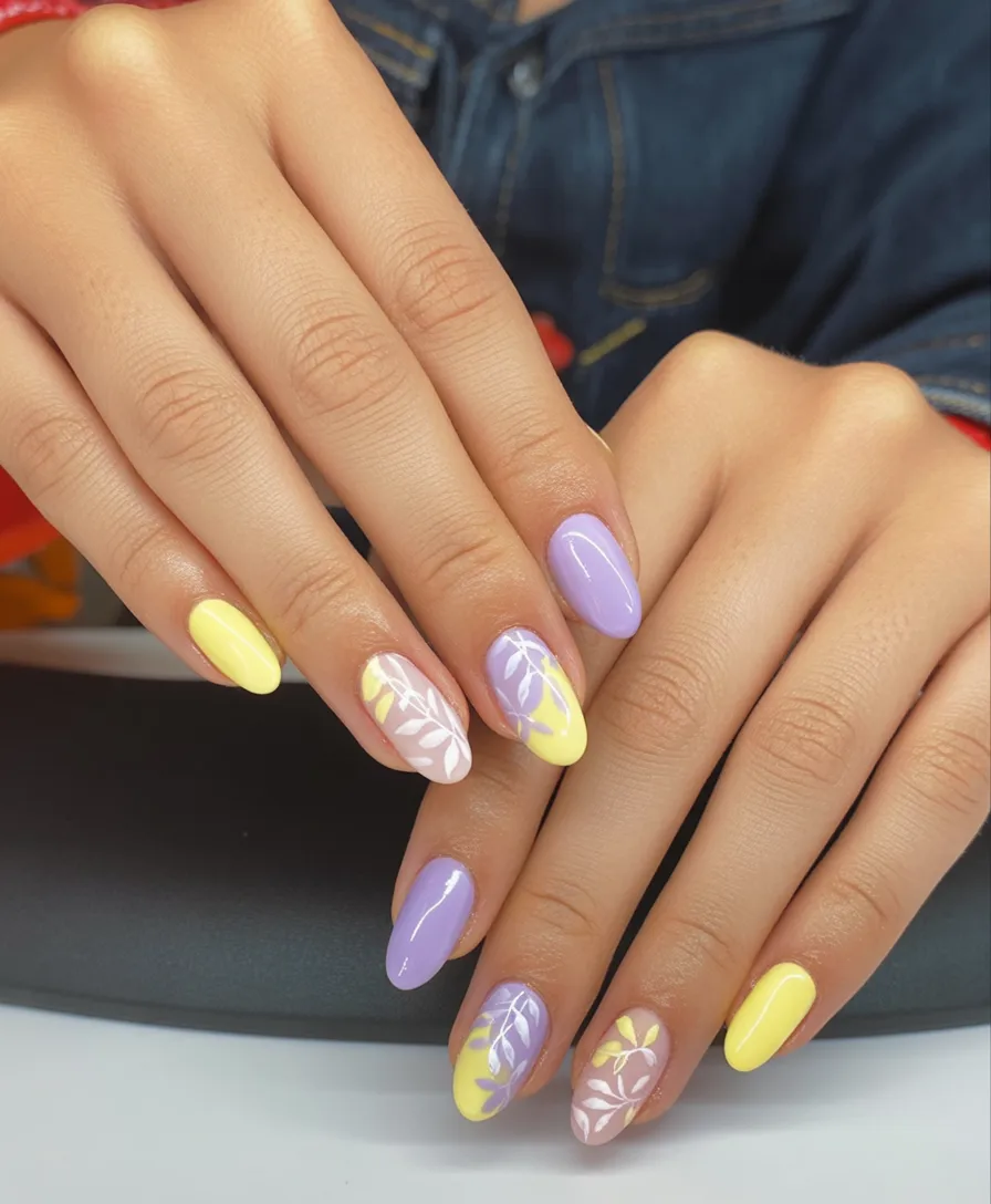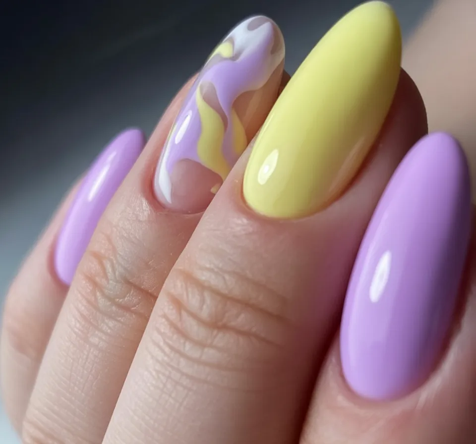 4. Soft Yellow and Lavender Almond Spring Nails