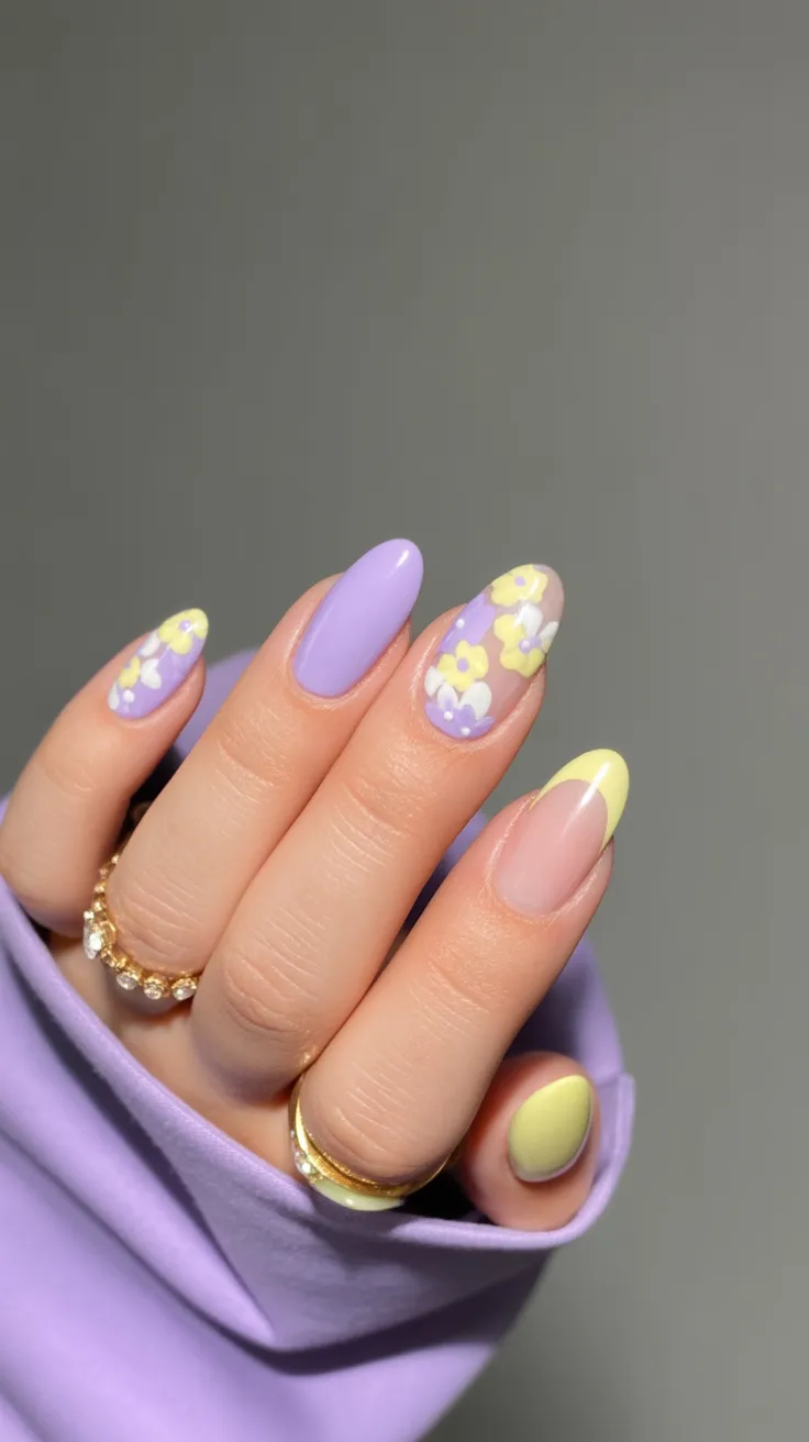 13. Lavender and Yellow Almond Nails with Floral Art