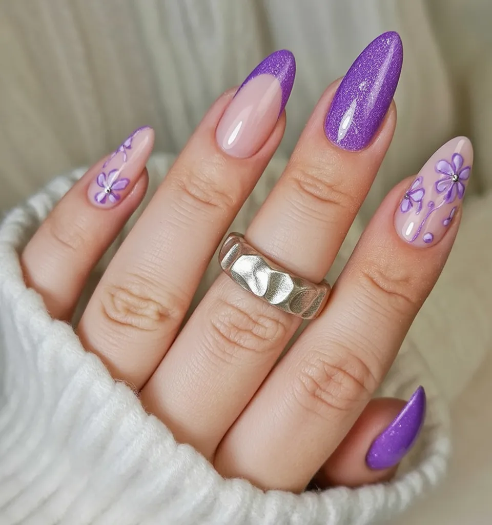 3. Purple Chrome Almond Nails with Floral Details