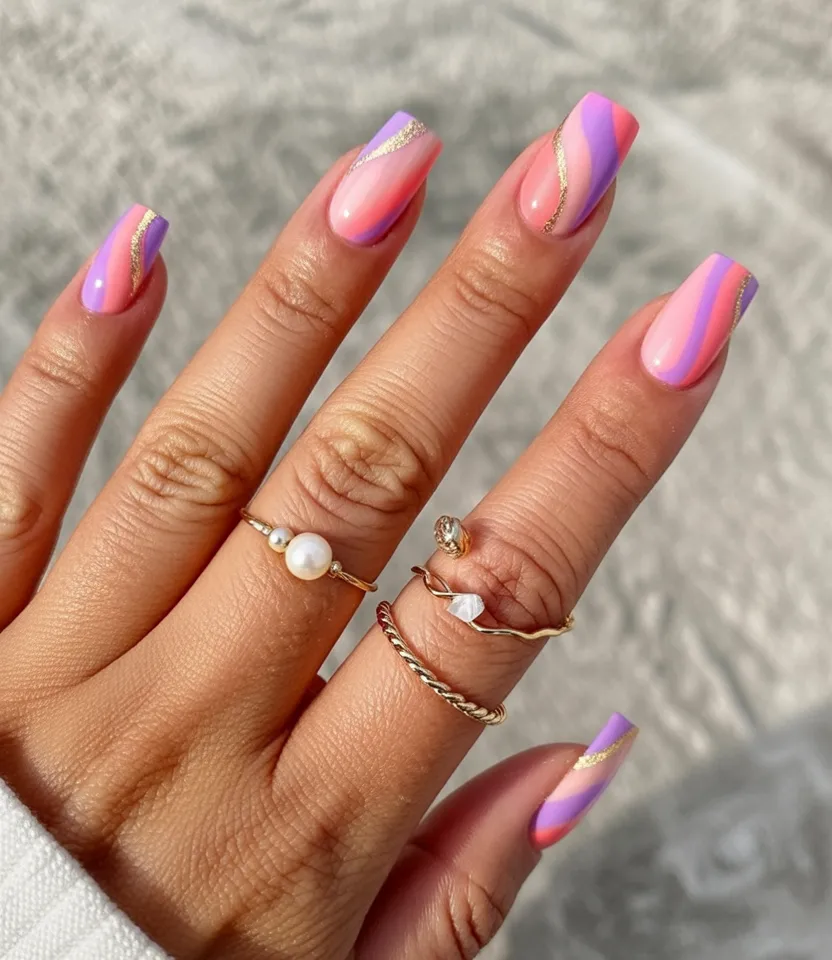 6. Pink and Lavender Coffin Nails with Gold Lines
