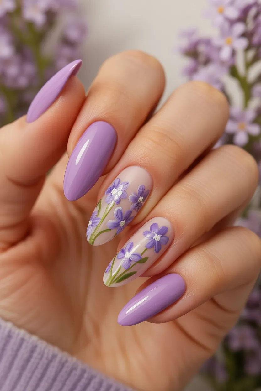 10. Minimal Lavender Almond Nails with Floral Detail