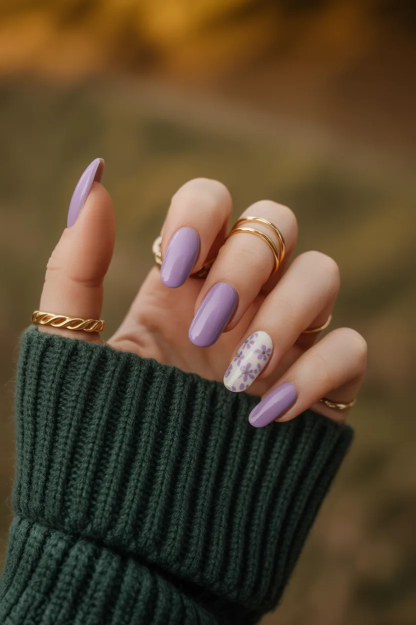 This manicure feels calm, grounded, and quietly beautiful. The solid lavender nails create a smooth, cohesive base, while the single floral accent adds a personal, thoughtful detail. It’s the kind of look that feels comforting—reliable but never boring, familiar but still special.