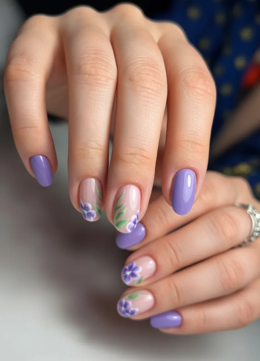 5. Lavender Short Nails with Floral Art