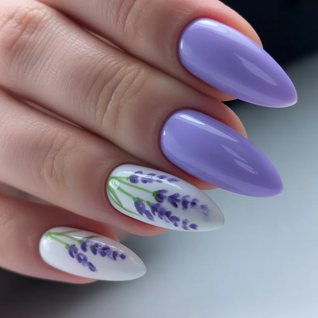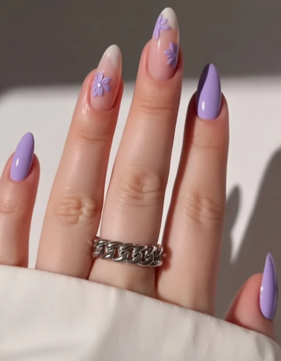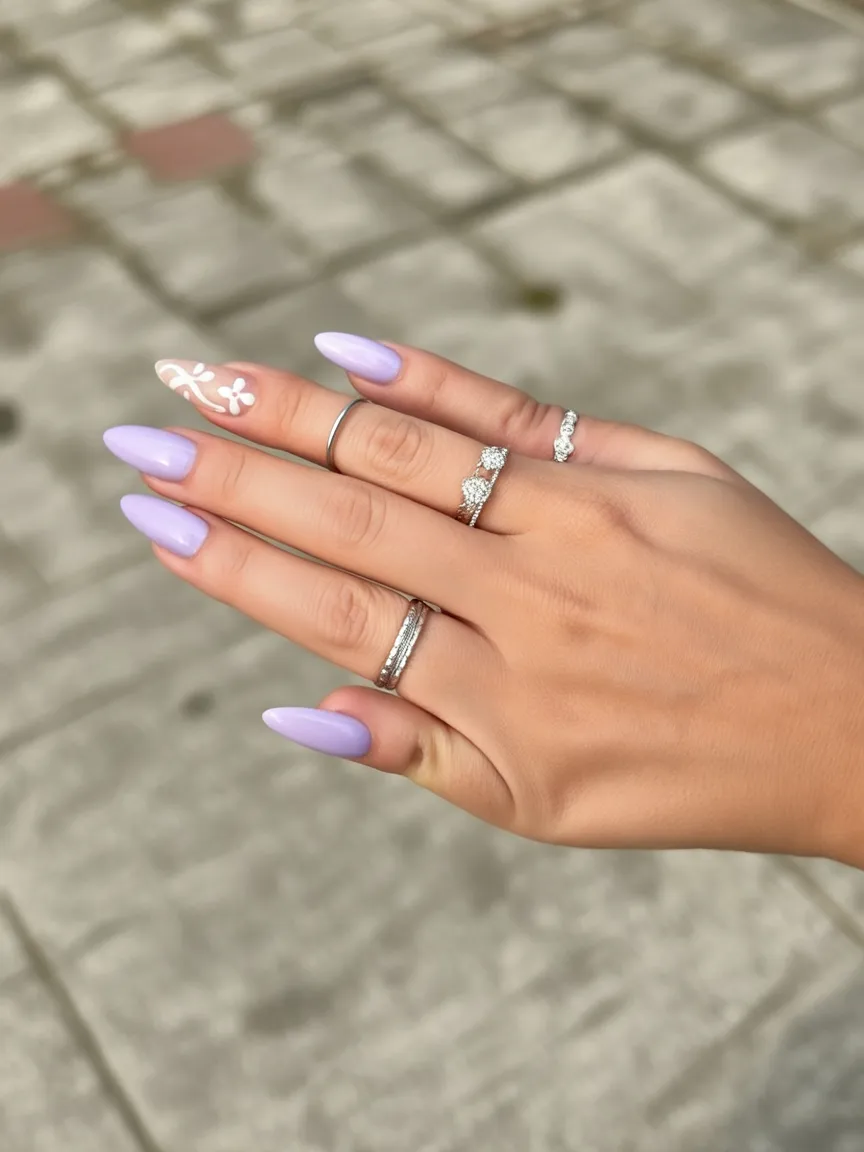 15. Classic Lavender Almond Nails with Floral Accent Nail