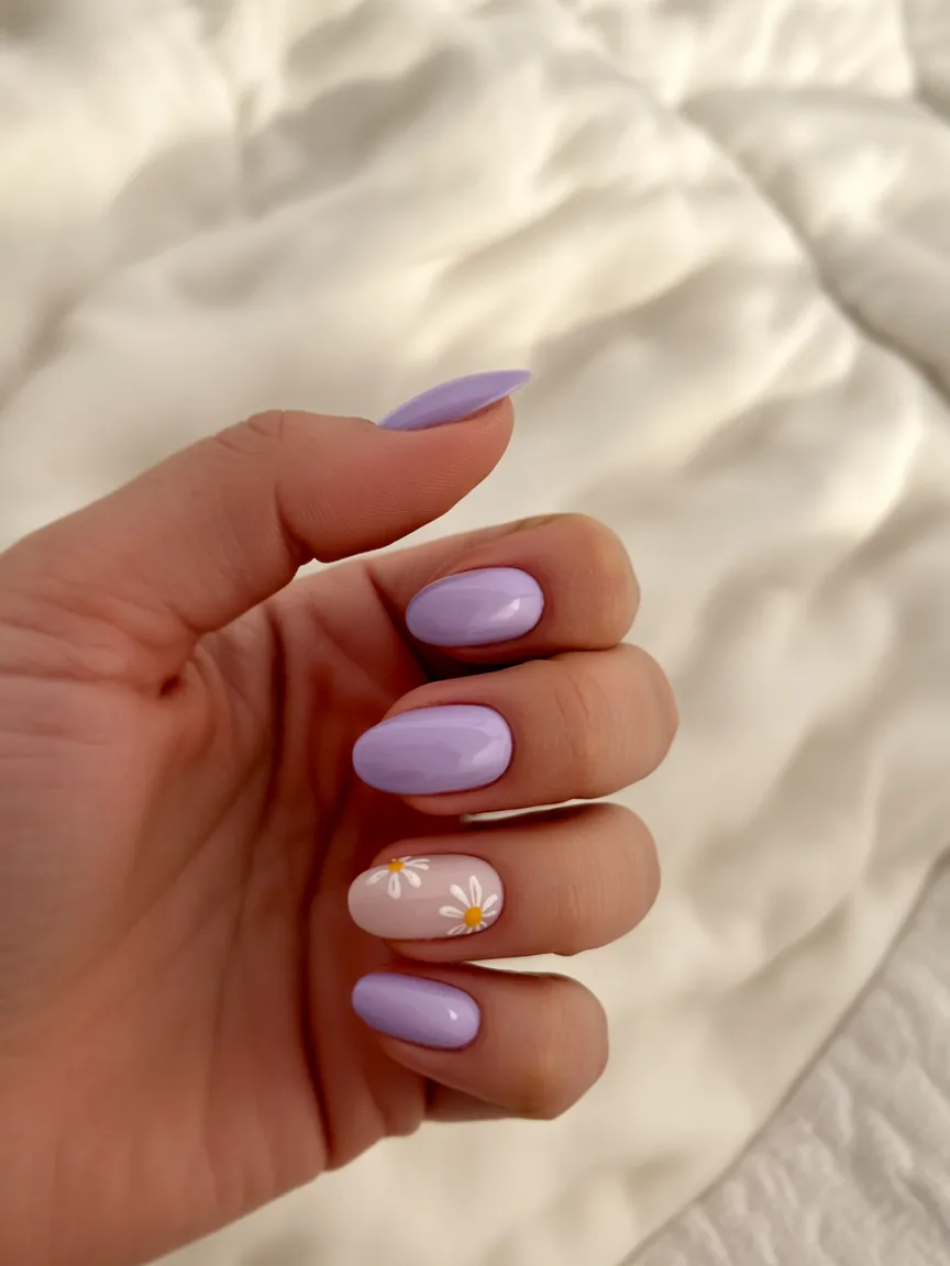 12. Lavender Short Almond Nails with Daisy Accent