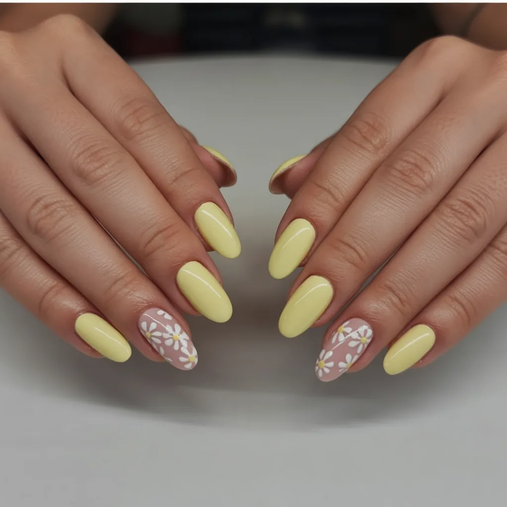 18. Soft Yellow Almond Nails with Floral Accent Design