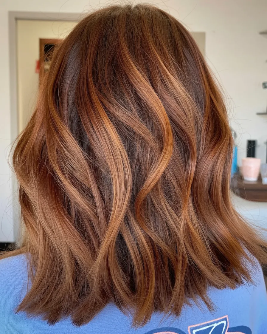 This warm, copper-infused light brown look is pure sunshine. The Balayage effect adds layers of Caramel highlights and subtle red Highlights that give the hair incredible depth and vibrancy. The waves feel relaxed and Natural, like you just stepped out of a coastal getaway.