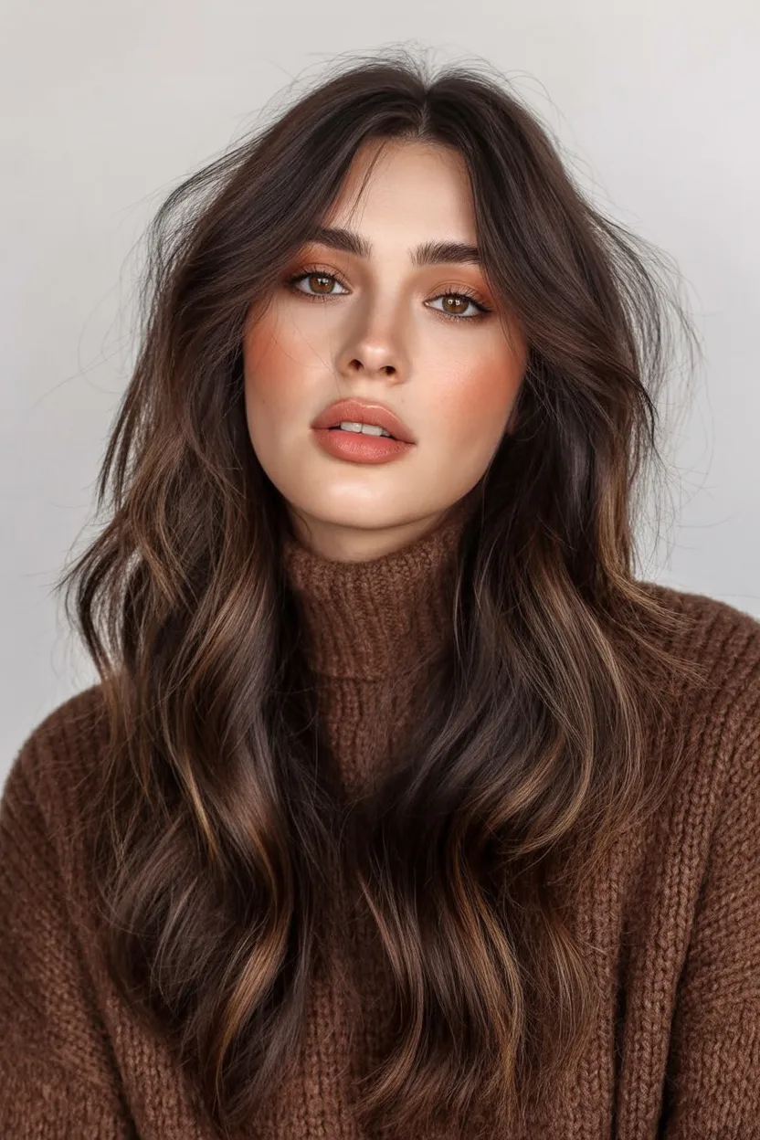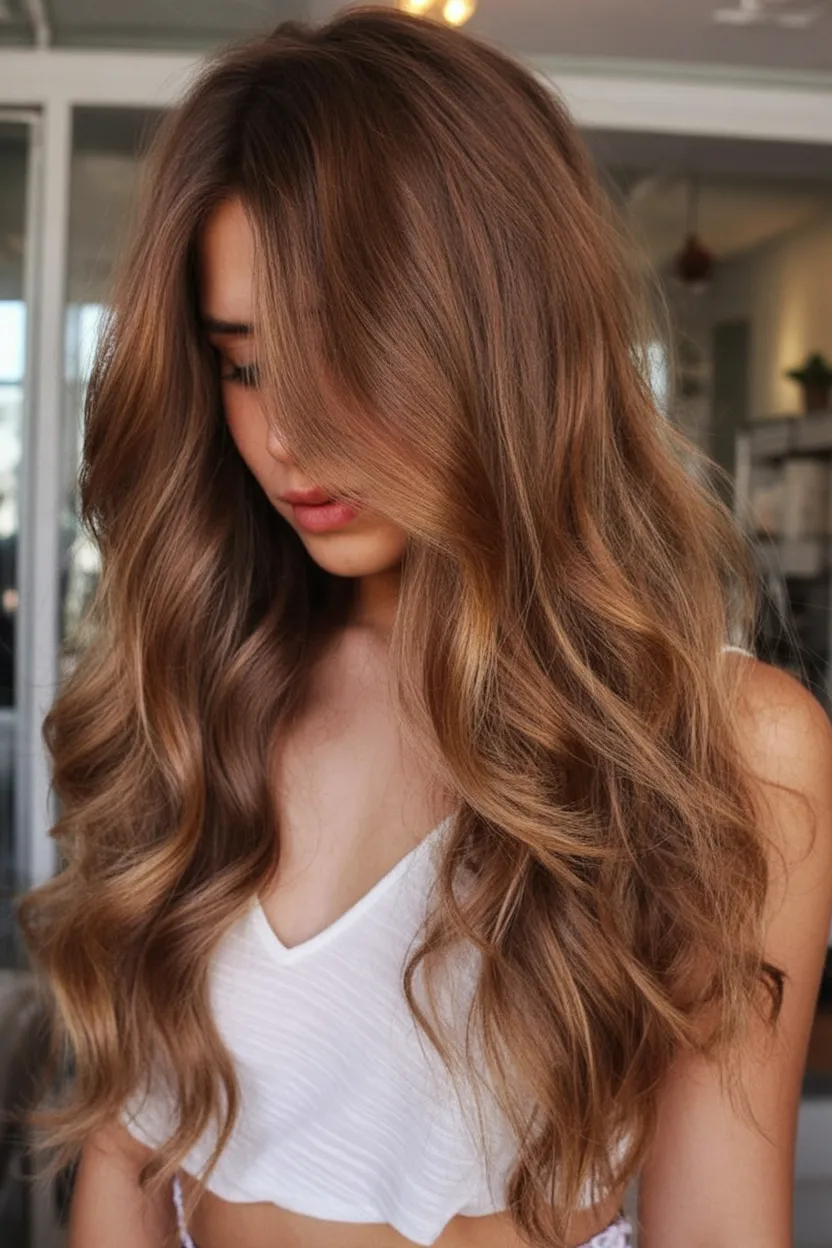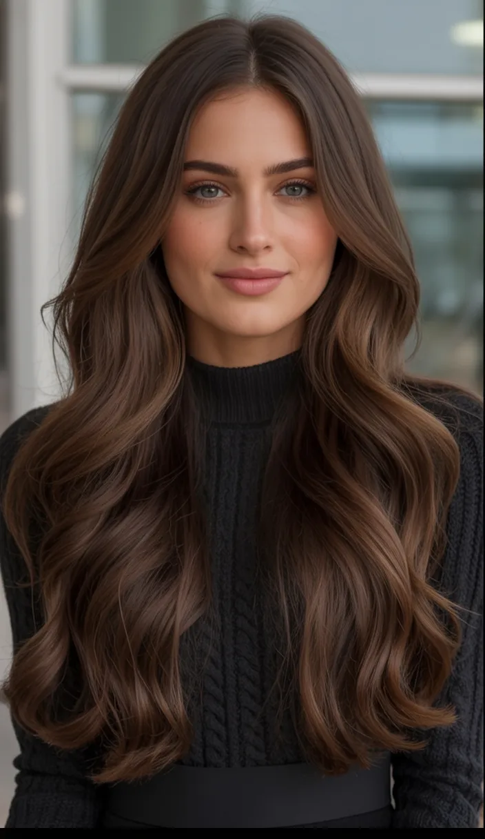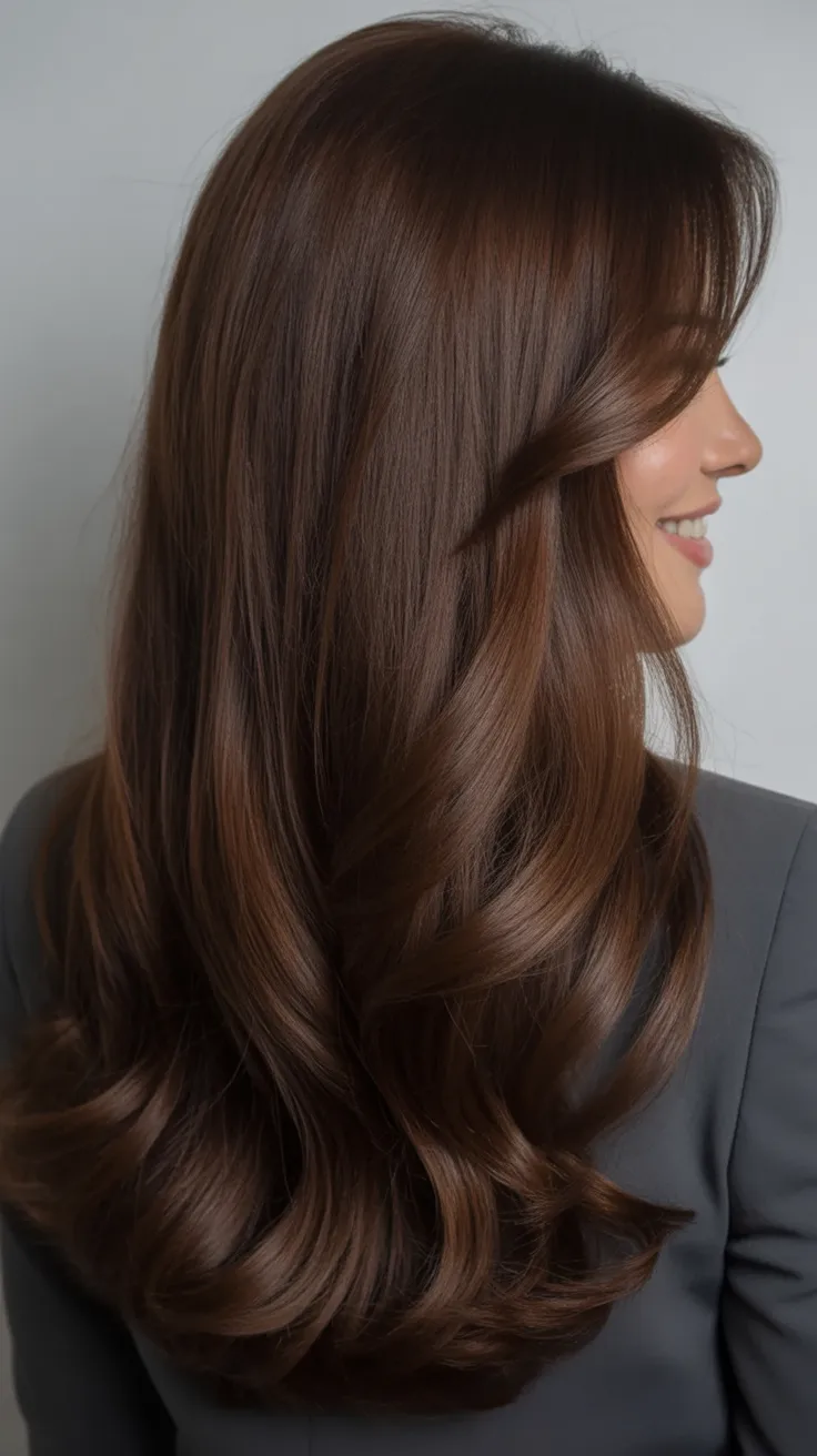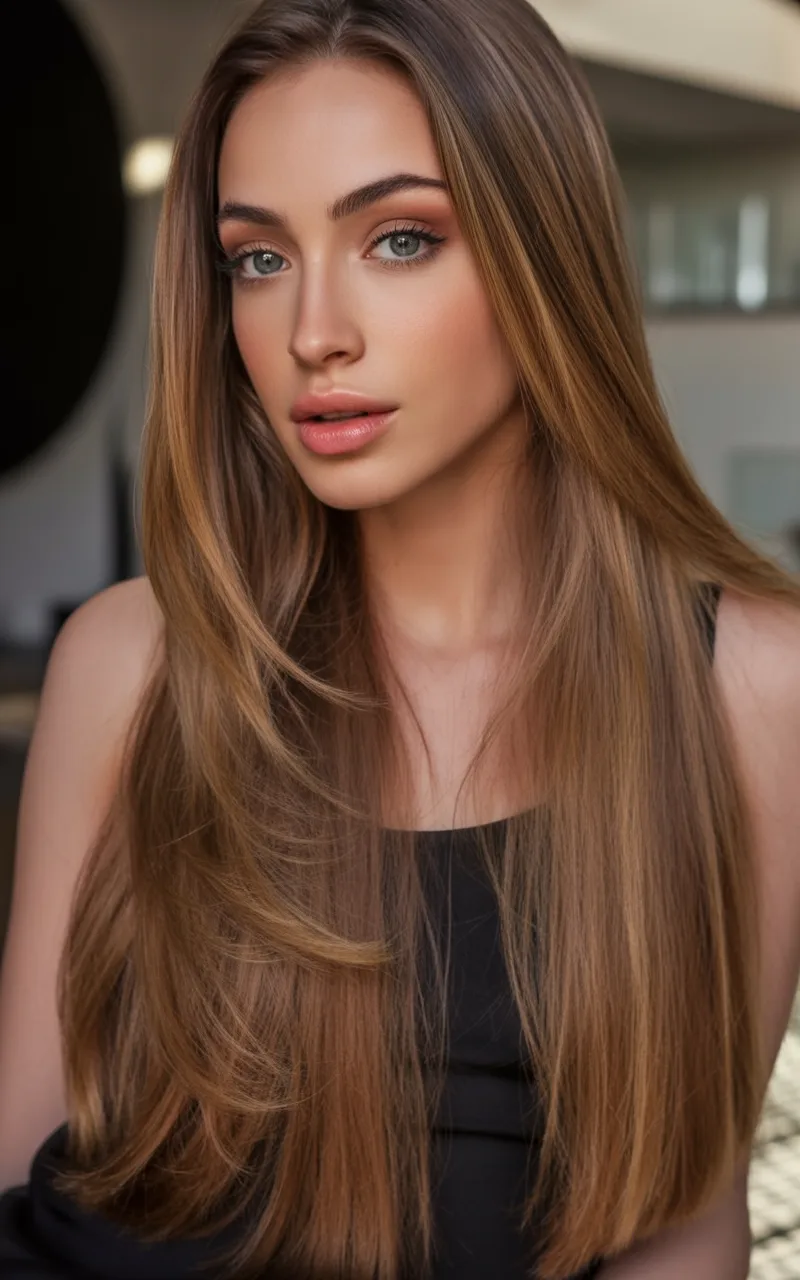 This look is perfect for women with medium to thick hair who love Long layers but don’t want high-maintenance contrast. Subtle Lowlights can enhance that dimensional finish, while a large curling wand brings out the movement. It’s a beautiful choice if you want Natural depth with a hint of glow.