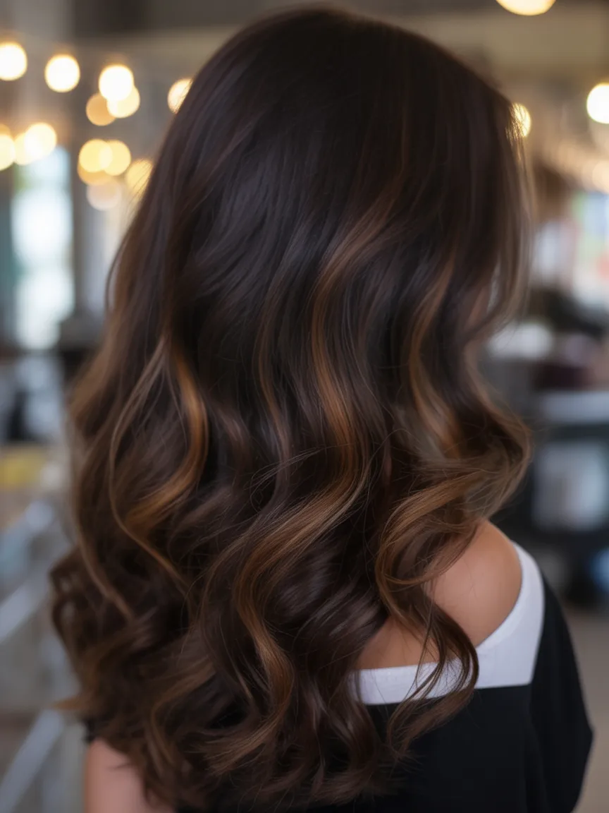 This style is especially flattering for women with naturally wavy or Curly hair who prefer something elegant yet manageable. Enhance the texture with a large curling wand and a flexible-hold spray. The Lowlights keep the Color looking multidimensional, making it a smart choice if you want depth without dramatic contrast.