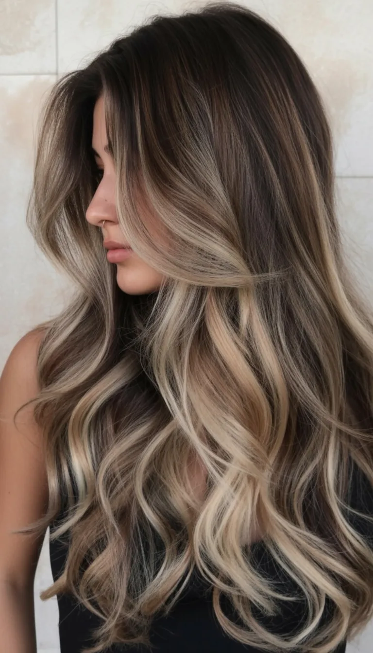 If you’re drawn to cooler hues, this Balayage blend is such a showstopper. The light brown roots transition into creamy Blonde highlights with a soft, ashy finish that feels modern and chic. The waves look airy and weightless, giving that effortless model-off-duty Aesthetic.