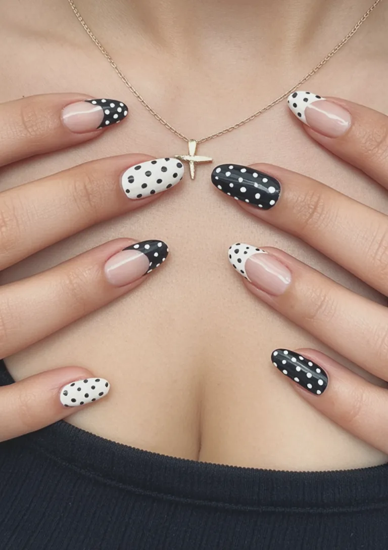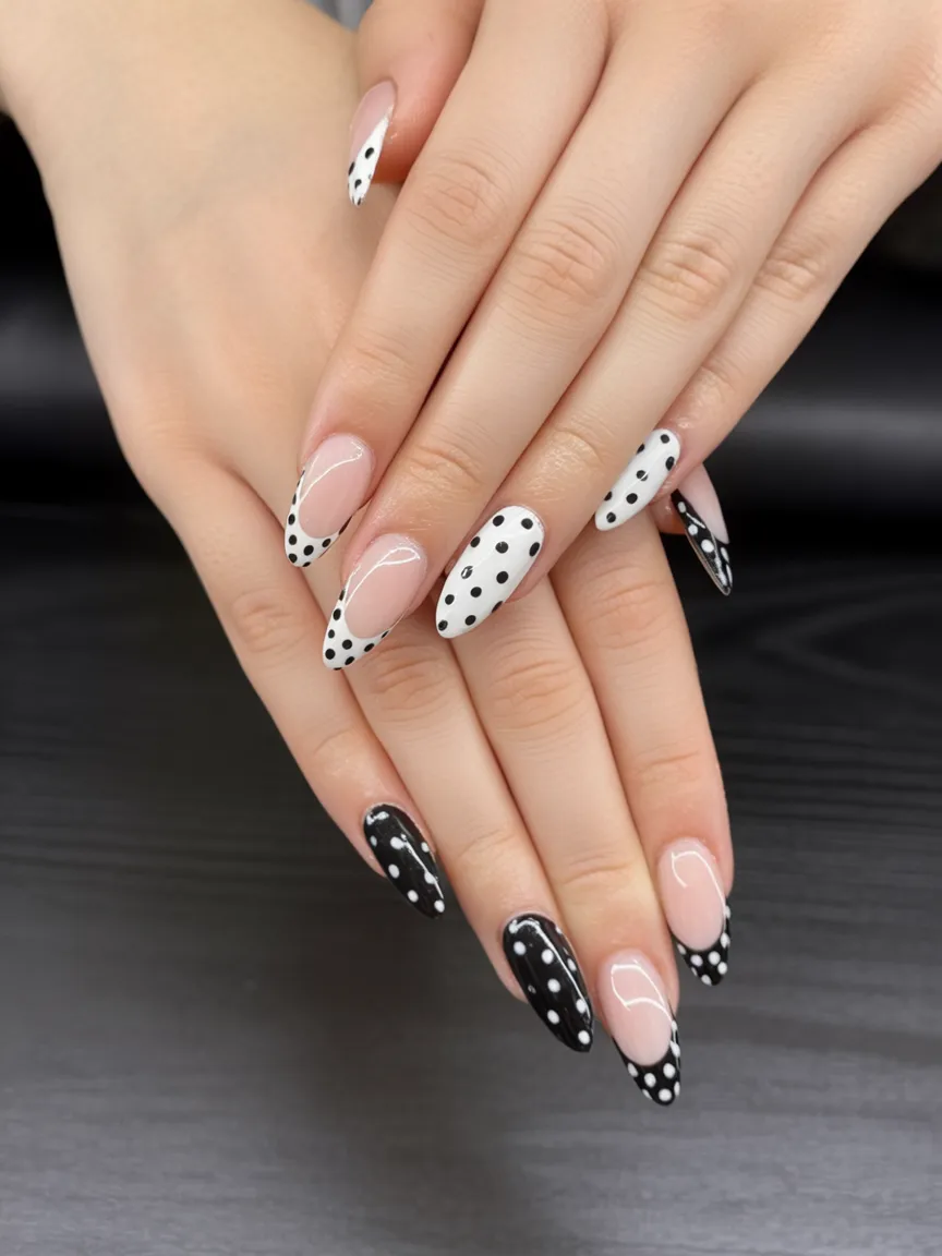 Black and White together always feels intentional. This playful mix of polka dots across alternating nails brings a retro charm that somehow still feels completely current. The almond shape softens the graphic contrast, making the whole look feel stylish rather than loud. It’s bold but balanced.