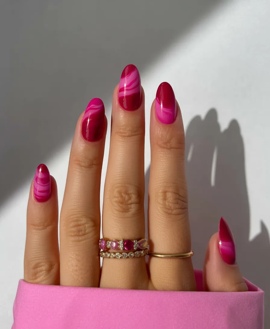 These Pink marble swirls feel like modern art on your fingertips. Rich Red undertones blend with brighter Pink ribbons, creating movement and depth that’s impossible to ignore. It’s bold, confident, and unapologetically glamorous—the kind of manicure that turns heads when you’re holding a glass of wine or gesturing mid-conversation.