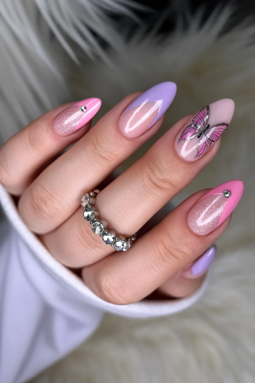 This design feels like stepping into a soft spring day where everything is blooming. The blend of Pink and Purple tones creates a gentle gradient, while that delicate butterfly detail adds pure magic. There’s something so feminine and light about it—almost like wearing a tiny piece of art on your fingertips. It’s playful, yes, but still polished enough to feel grown-up and chic.