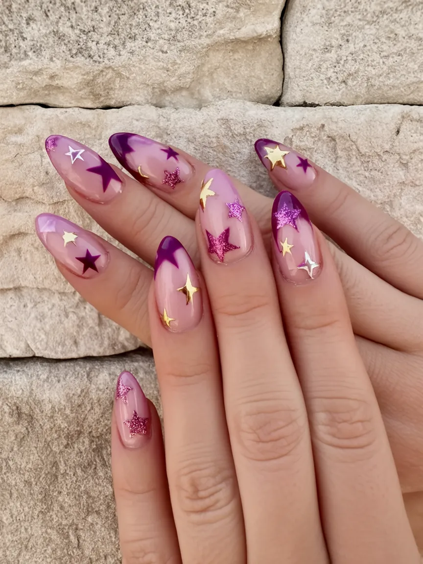 What makes this look special is the balance between Simple transparency and bold Purple accents. The almond shape elongates the fingers beautifully, and the mix of glossy and glitter finishes keeps it modern for 2026. It works especially well on medium to longer nails and suits anyone who loves a little magic in their everyday style without going full drama.