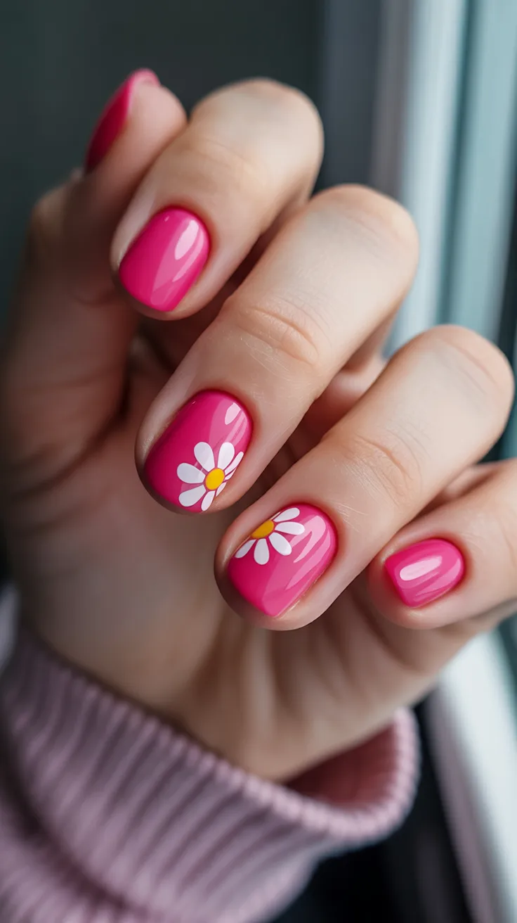 5. Hot Pink Daisy Short Nails