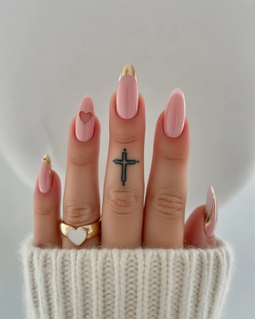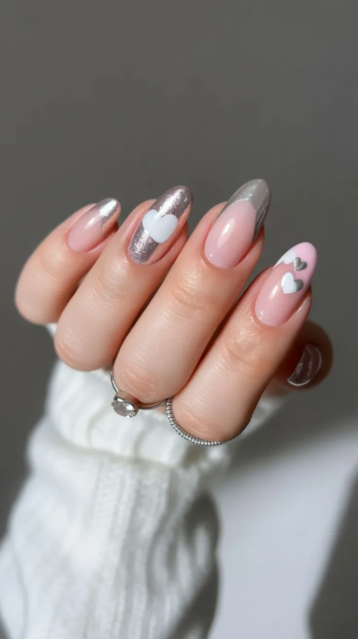 This manicure feels sleek, modern, and just a little bit edgy. The cool metallic chrome paired with soft blush nails creates that beautiful contrast between strong and romantic. And those delicate heart outlines? They add a subtle sweetness without overpowering the look. It’s giving confident woman energy—polished, intentional, and totally put together.