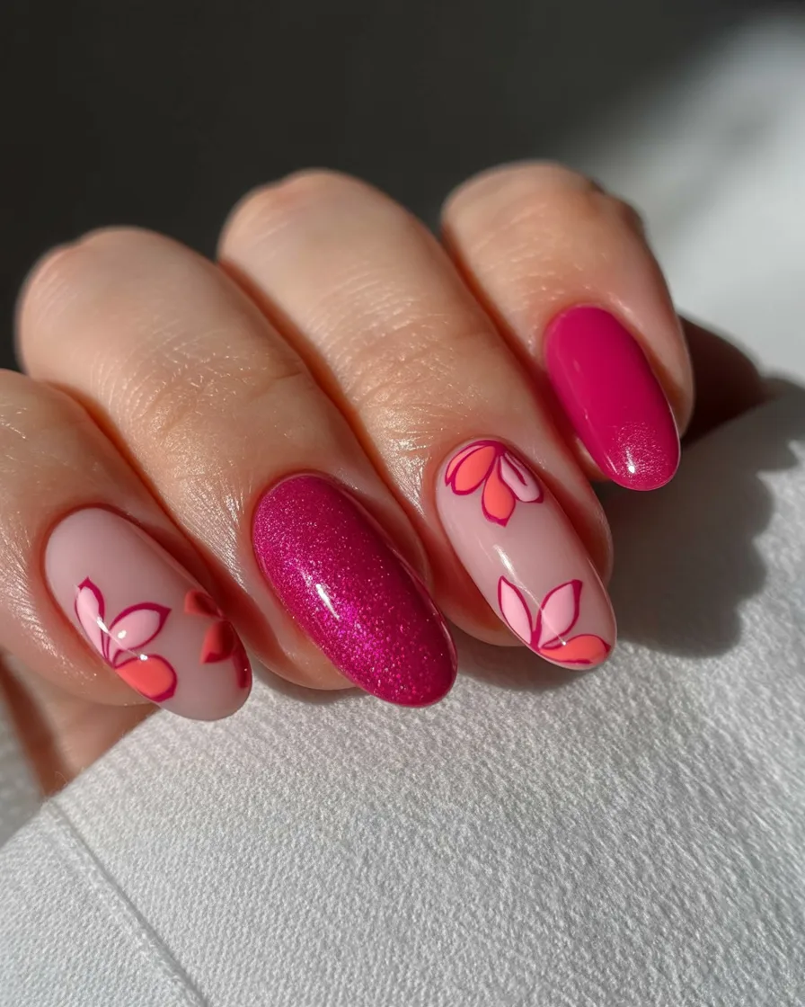 Bright, bold, and unapologetically feminine—this Pink manicure feels like pure joy. The vibrant shimmer paired with delicate floral linework creates a gorgeous contrast between playful and refined. It’s the kind of design that instantly lifts your mood the second you glance at your hands.
