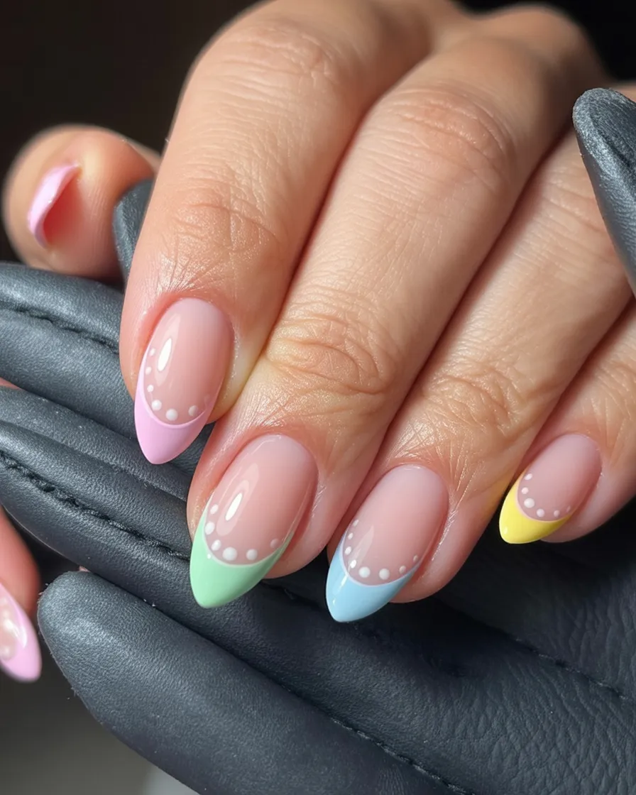 This manicure feels lighthearted and joyful, like opening your windows on the first truly sunny spring morning. The soft nude base paired with pastel French tips in pink, green, blue, and yellow creates a gentle rainbow effect that feels cheerful without being loud. The tiny dotted detail adds a Cute, playful finish that keeps the look fun but still polished and wearable for everyday life.