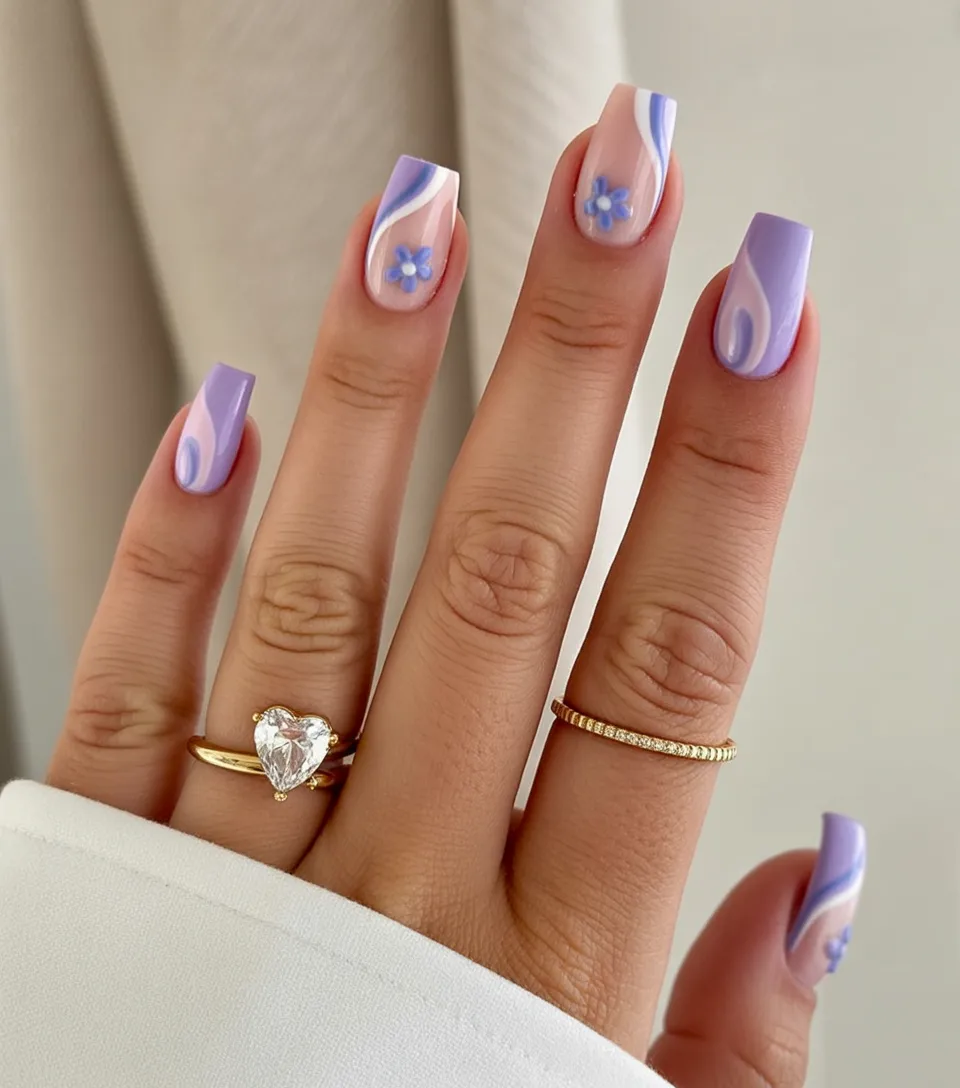 This design feels soft, calm, and quietly confident. The lavender tones paired with gentle wave patterns instantly give off that fresh-spring-energy vibe without being loud. It’s the kind of manicure that looks polished from every angle, but still feels light and relaxed—perfect for easing into warmer days with grace and a little bit of fun.