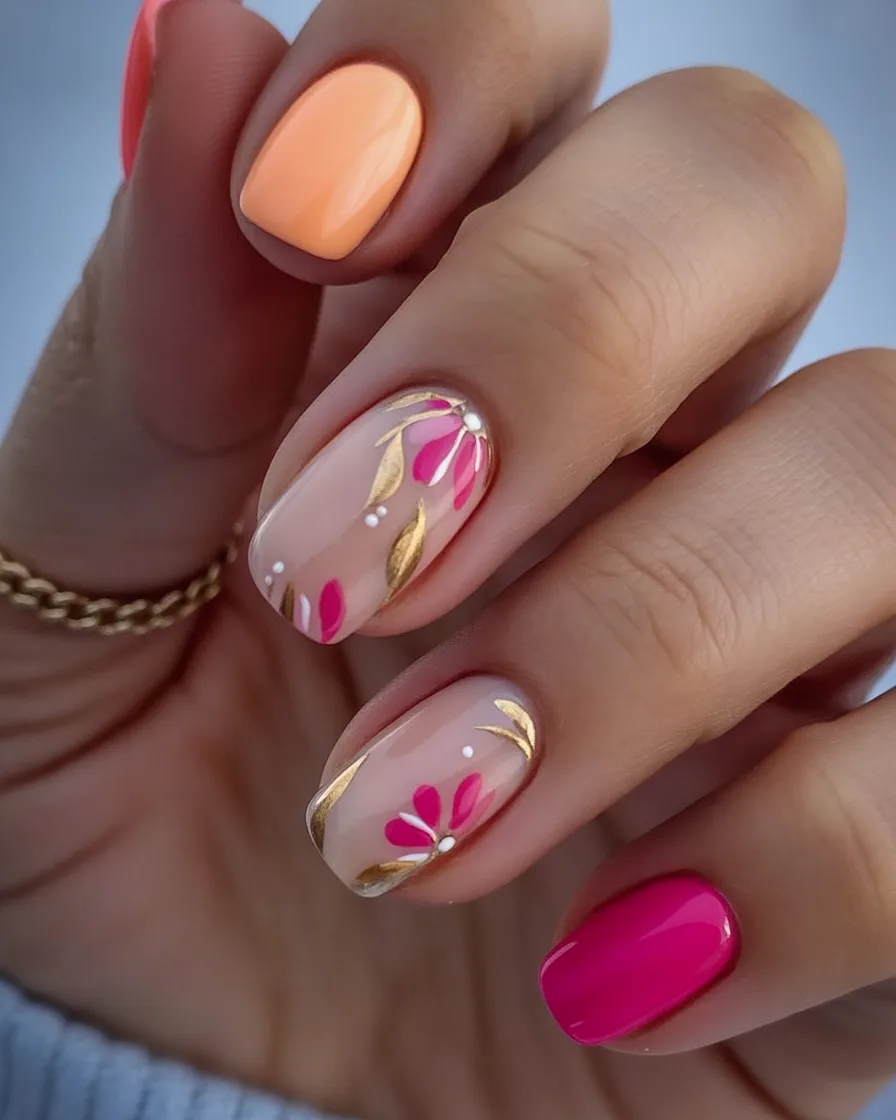 This is a great choice if you enjoy fun color combinations on short nails. The rounded shape keeps it practical, while the floral details add just enough art to stand out. It’s easy to wear, easy to love, and perfect for welcoming brighter days ahead.