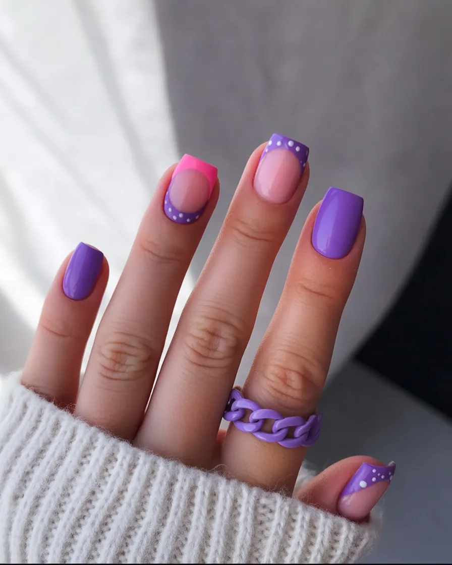 This manicure feels playful in a very grown-up way. The purple French tips instantly catch the eye, but it’s the tiny dotted detail that gives it personality. There’s something fun and confident about this look—like you’re not afraid of color, but you still want everything to feel polished and intentional.