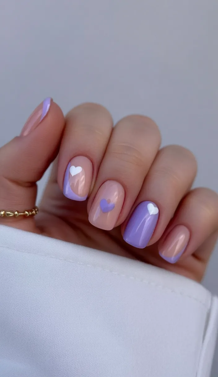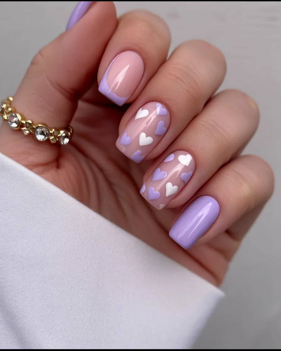 There’s something sweet and comforting about this lavender heart design. It feels gentle, romantic, and a little nostalgic—like handwritten notes tucked into a book. The mix of nude and soft purple tones keeps the look calm, while the heart details add just the right touch of Cute personality.