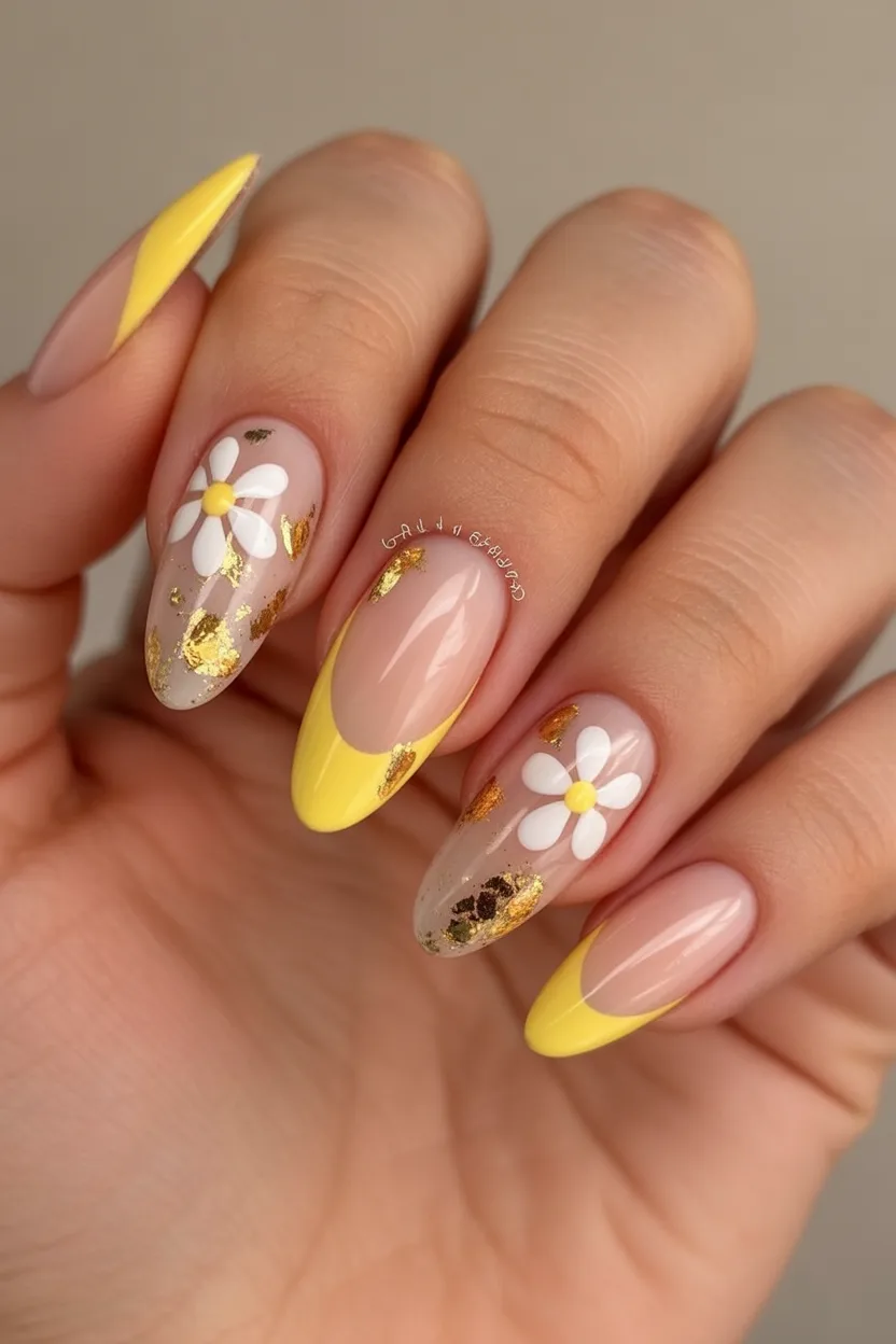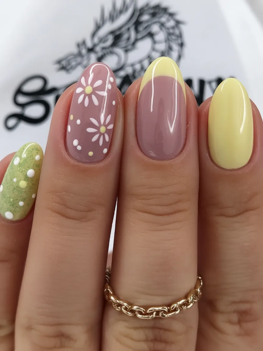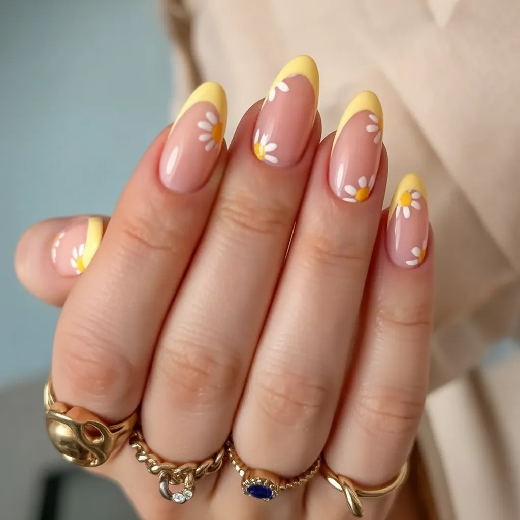 These nails instantly bring a smile. The soft nude base with sunny yellow French tips and delicate daisy Art feels warm, optimistic, and full of spring Inspiration. It’s the kind of manicure that looks effortless but still makes a statement—perfect for those days when you want your hands to feel fresh, happy, and put together.
