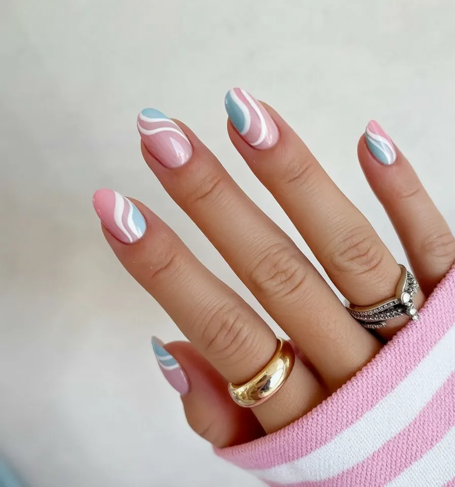 This design works perfectly on almond nails and is perfect for those who love smooth, long-lasting gel styles. The pastel colors make it easy to mix and match with different outfits, and the swirl art adds a fun touch. If you are looking to refresh your nails for spring, this is super inspiring.