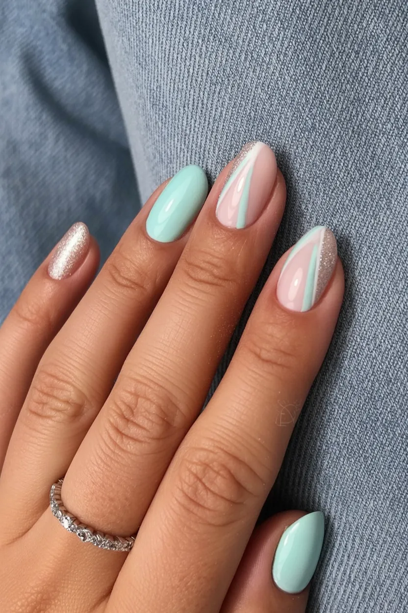 This manicure feels fresh, modern, and quietly sophisticated. The mint green paired with nude tones and fine geometric lines gives off a clean, organized energy—like a well-planned spring refresh. The subtle shimmer running through the design adds a hint of elegance, making it feel polished without stealing the spotlight. It’s calm, stylish, and very easy on the eyes.