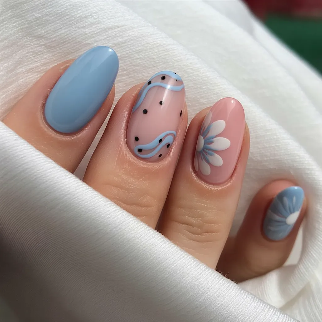This manicure feels cheerful, fresh, and full of spring energy. The soft mix of blue and pink paired with floral art gives it a light, optimistic mood. It’s the kind of design that makes you smile every time you look down—simple, joyful, and full of inspiration.
