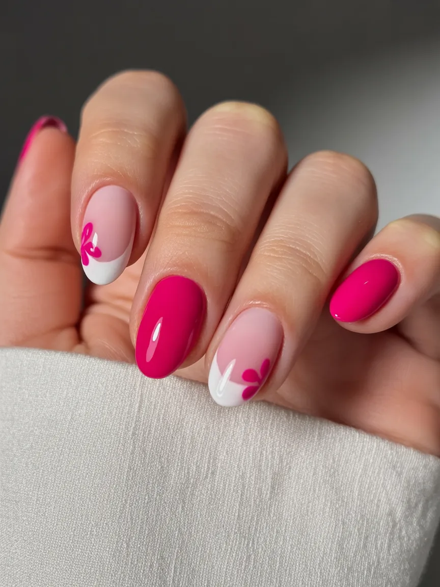 This manicure feels confident and feminine with a playful edge. The bold pink shade paired with delicate floral accents creates a beautiful contrast that feels modern and fresh. It’s the kind of look that instantly lifts your mood and adds a pop of Color to even the simplest outfit.