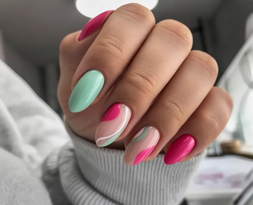 This set feels energetic, playful, and full of personality. The combination of pink and mint with flowing swirl patterns creates movement and visual interest, giving the nails a lively, artistic vibe. It feels confident and expressive—perfect for spring when everything feels lighter and more colorful.