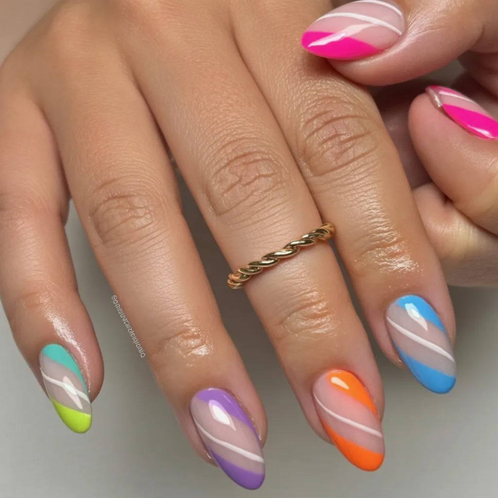 1. Playful Color Block Swirl Almond Nails