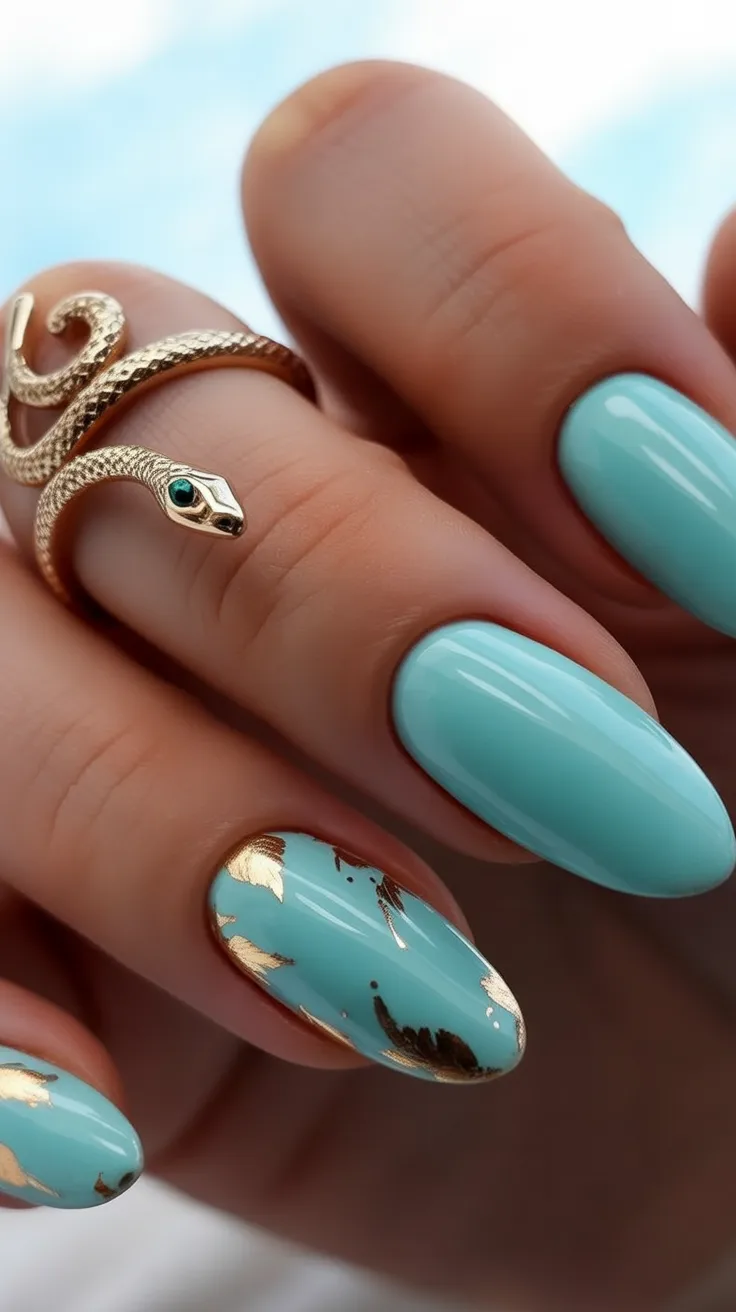 7. Turquoise Foil Accent Almond Nails